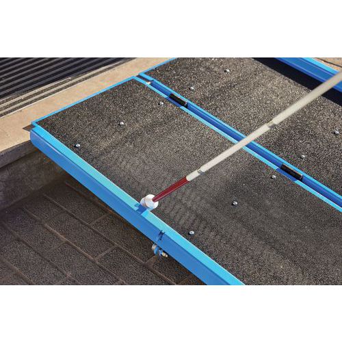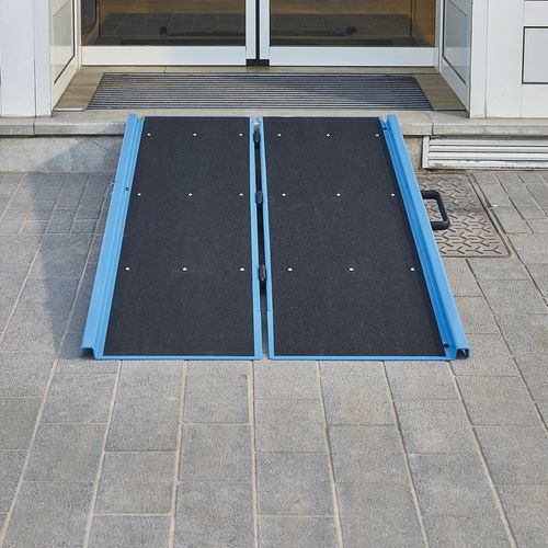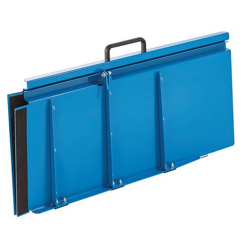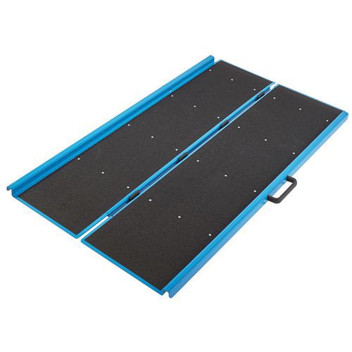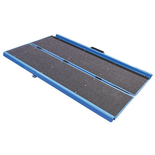 Rampa d'accesso per carrelli, sedie a rotelle, ecc. Pratica da conservare, la rampa è ripiegabile in 2. Dotata di un rivestimento antiscivolo.