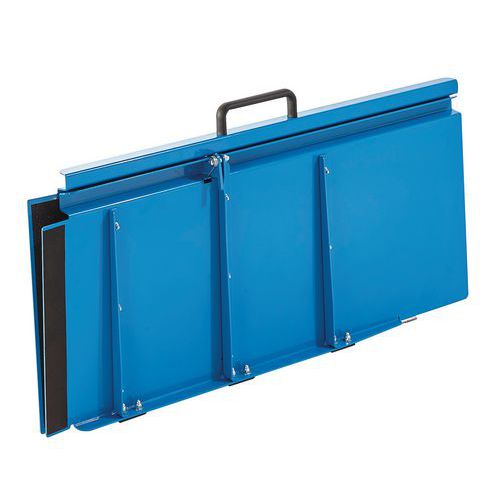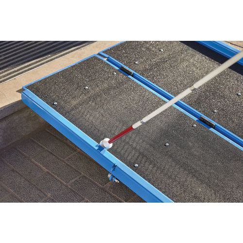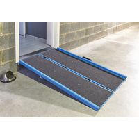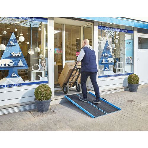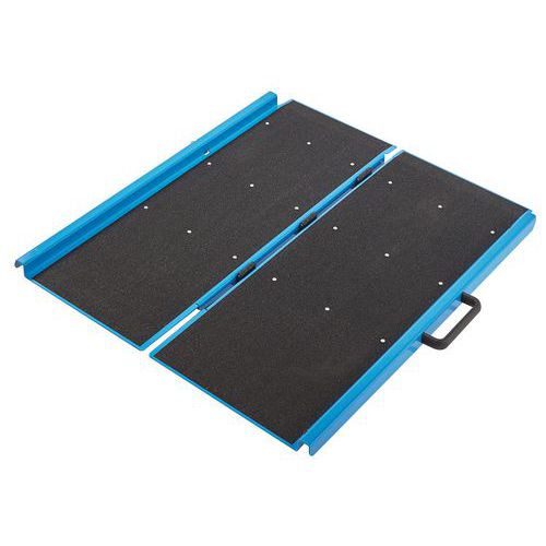 Rampa d'accesso per carrelli, sedie a rotelle, ecc. Pratica da conservare, la rampa è ripiegabile in 2. Dotata di un rivestimento antiscivolo.