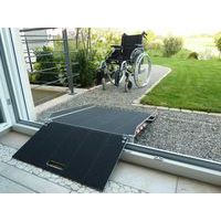 Rampa da soglia per persone a mobilità ridotta con capacità di carico di 300 kg. Piedi con viti regolabili in altezza per l'adattamento a quasi tutte le soglie delle porte. Design pieghevole per una sistemazione facile e un ingombro ridotto. Rivestimento antiscivolo per una maggiore sicurezza. Peso netto leggero per un facile maneggiamento.