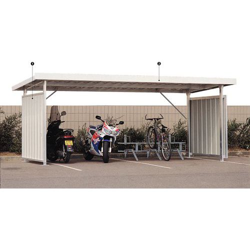 Riparo costituito da 2 pannelli laterali profilati e 1 tettoia Solido fissaggio al suolo mediante piastra saldata su paletti. Riparo per biciclette facile da assemblare e fissare mediante semplici bulloni.