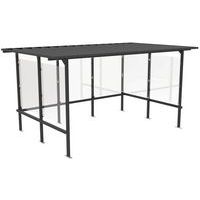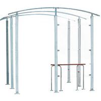 - Riparo per fumatori standard (4,50 x 2,50 m), con struttura tubolare in acciaio galvanizzato e piegata e copertura in policarbonato alveolare con trattamento anti-UV;