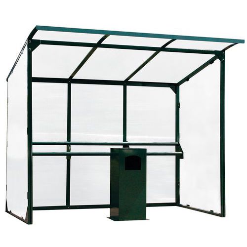 Riparo per fumatori in stile industriale. Massima protezione: pareti fino al suolo. Ottima resistenza alle intemperie. Di facile manutenzione. Montaggio : Da montare