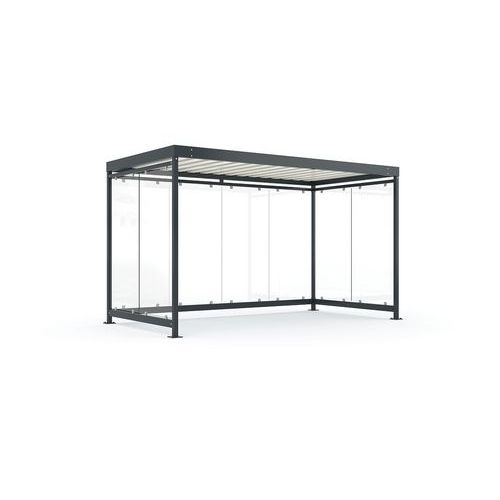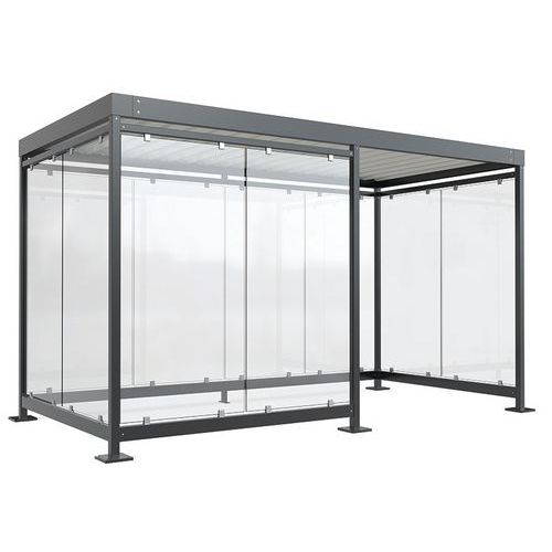 Riparo per fumatori Cologne elegante. Struttura in acciaio galvanizzato. Tettoia in lamiera perforata resistente alle intemperie e di dimensioni variabili. Riparo per veicoli, biciclette, attrezzature, ecc. Pareti laterali a scelta.