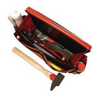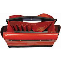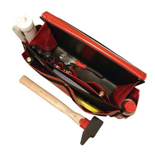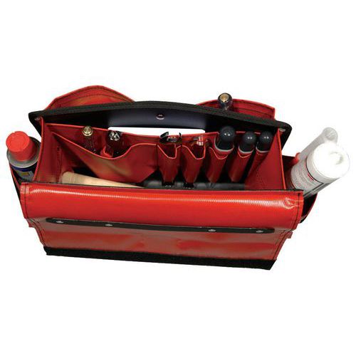 Composizione: -1 tasca frontale - 2 tasche laterali - 1 parete divisoria porta-utensili con alveoli - 1 chiusura con patta in velcro - 1 manico - 1 tracolla
