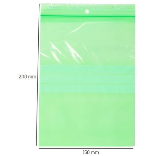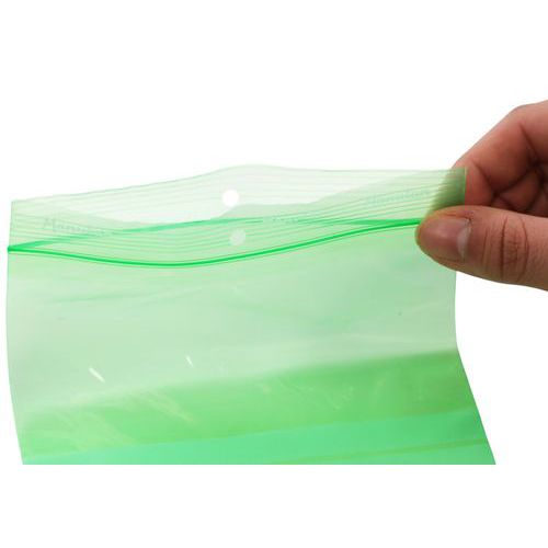 Sacchetto con chiusura a zip verde. Banda striata per una migliore presa. Sacchetto con foro per l'aggancio. Garantisce la protezione dei prodotti dalla polvere.