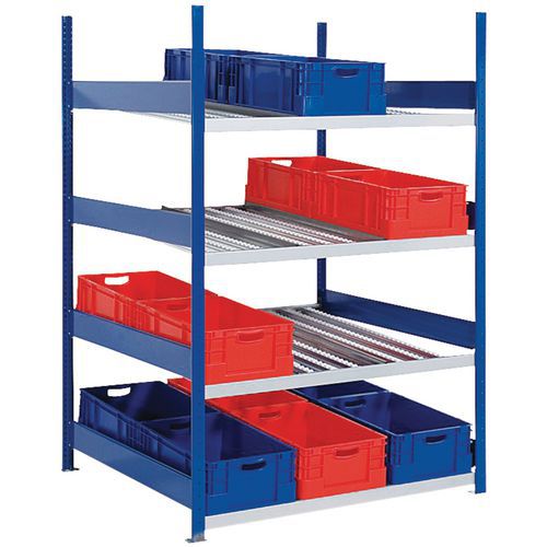 | Descrizione | Scaffalatura a rulli Kanban, Carico max. per livello: 180 kg, Altezza: 2000 mm, N. di livelli: 4 |