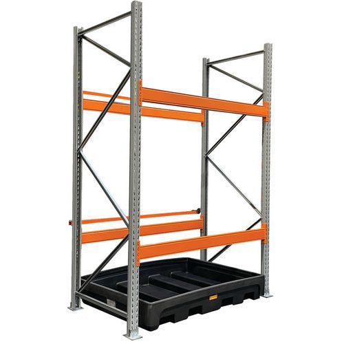 Scaffalatura con vasca di raccolta robusta in acciaio galvanizzato, ideale per lo stoccaggio.