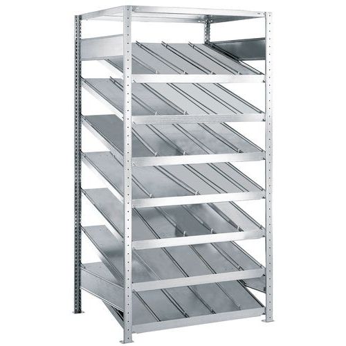 - Scaffalatura dinamica in acciaio a ripiani inclinati adatti al sistema FIFO: primo a entrare, primo a uscire.