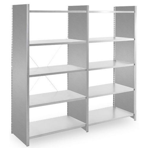 Scaffalatura da tavolo leggera e robusta. Finitura galvanizzata. Struttura chiusa sui lati con spalle piene. In acciaio inossidabile, ideale per ambienti umidi. Facile estensione con l'aggiunta di 1 o più elementi successivi. Finitura galvanizzata ideale per ambienti umidi ed esterni.