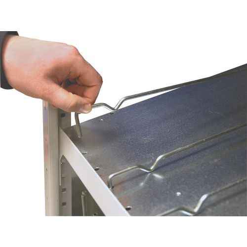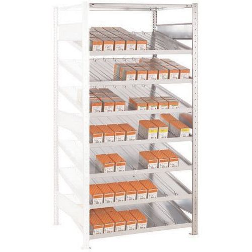 Scaffalatura dinamica in acciaio a ripiani inclinati adatti al sistema FIFO: primo a entrare, primo a uscire. Configurazione ottimale: ripiano inclinato dotato di 5 guide di separazione e 2 guide laterali. Ripiano rinforzato da corrente, corrente anteriore rialzato di 15 mm per impedire la caduta della merce. Facile montaggio a incastro dei ripiani e dell'estensione facilitato dall'aggiunta di elementi successivi. Ripiano regolabile in altezza in incrementi di 25 mm. Guide di separazione regolabili (in incrementi di 50 mm).