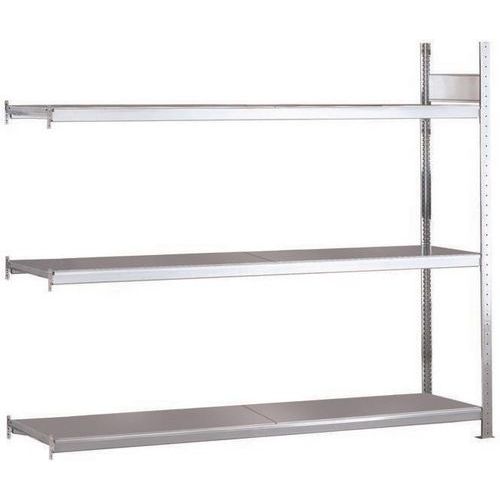 Solida scaffalatura da magazzino a livelli in lamiera d'acciaio piena. Stabile, senza crociera, accessibile dai due lati. Perfetta in abbinamento con altre scaffalature Easy-Fix. Alta resistenza alla corrosione con finitura in acciaio galvanizzato.