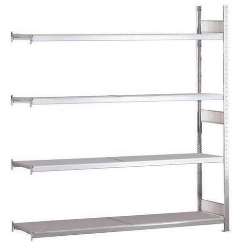 Solida scaffalatura da magazzino a livelli in lamiera d'acciaio piena. Stabile, senza crociera, accessibile dai due lati. Perfetta in abbinamento con altre scaffalature Easy-Fix. Alta resistenza alla corrosione con finitura in acciaio galvanizzato.