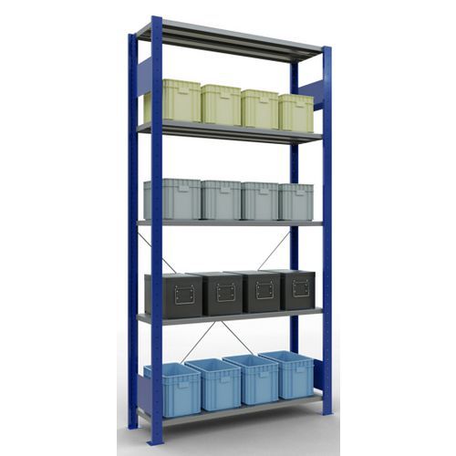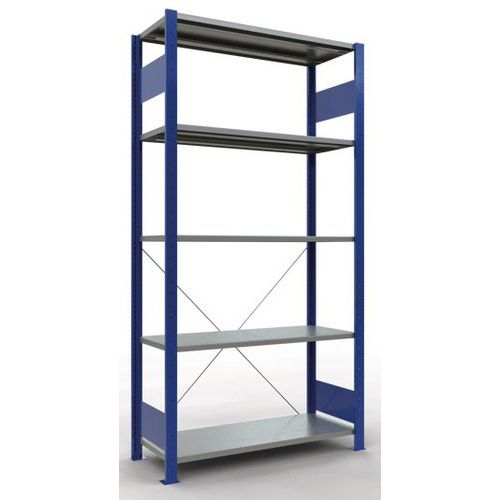 Sistema di scaffalatura robusto e completo con elegante finitura in vernice epossidica, grigia o blu. Ripiani pieni in lamiera d'acciaio per il supporto di prodotti di varie dimensioni. Scaffale industriale facile e rapido da montare a incastro senza l'uso di alcun utensile particolare. Facile estensione della scaffalatura con l'aggiunta di 1 o più elementi successivi.