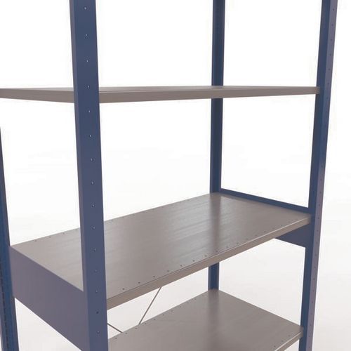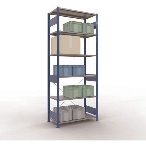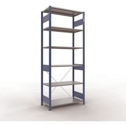 Sistema di scaffalatura robusto e completo con elegante finitura in vernice epossidica, grigia o blu. Ripiani pieni in lamiera d'acciaio per il supporto di prodotti di varie dimensioni. Scaffale industriale facile e rapido da montare a incastro senza l'uso di alcun utensile particolare. Facile estensione della scaffalatura con l'aggiunta di 1 o più elementi successivi.