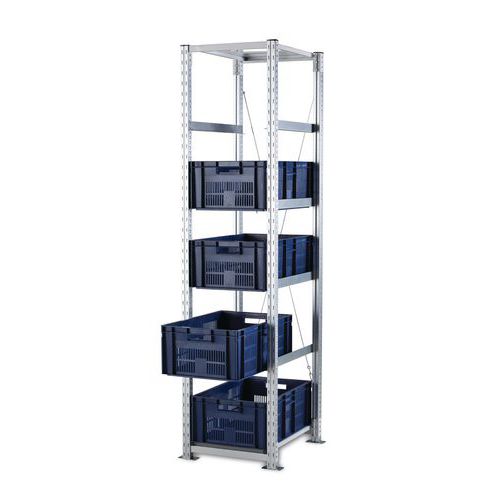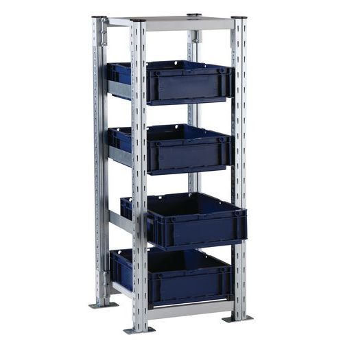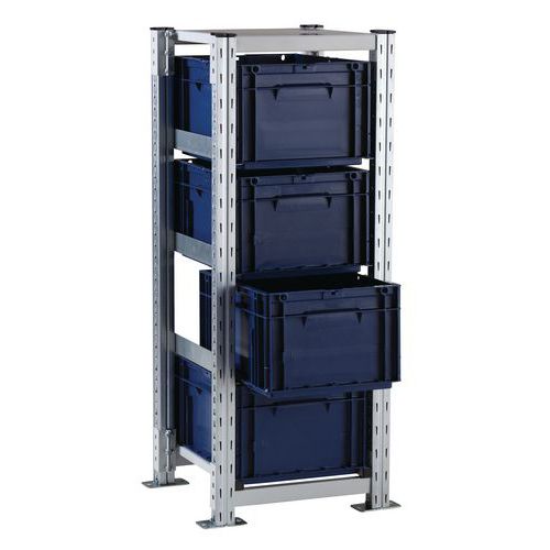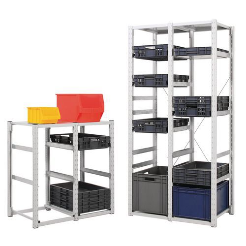 Scaffalatura speciale per contenitori conformi alla norma europea 400x300 e 600x400 mm. Adatta a tutti i contenitori a norma europea con altezza massima di 230 mm. Montaggio facile ed estensione agevolata con l'aggiunta di elementi successivi. Crociere non incluse. Trasformate i contenitori da trasporto in contenitori di stoccaggio!