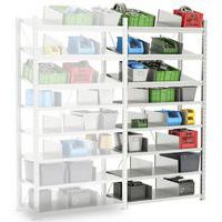 Il kit elementi di partenza è composto da 4 montanti e il kit elementi successivi da 2 montanti. Scaffalatura composta da montanti forati sui lati e sul lato anteriore, da ripiani in acciaio, da barre trasversali e piedi per assicurare la stabilità.