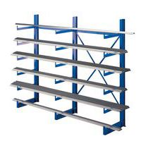 Scaffalatura cantilever monofronte e bifronte per lo stoccaggio in orizzontale. Protezione anti-scorrimento per impedire la caduta dei materiali. Estensibile con l'aggiunta di 1 o più elementi successivi. Scaffalatura cantilever a montaggio rapido grazie ai bracci saldati. Montanti dotati di 5 o 10 bracci fissi con finecorsa. Passo tra 2 montanti: 1200 mm. Passo tra 2 braccia: 1225 mm.