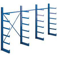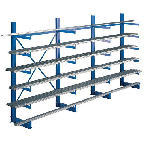Scaffalatura cantilever monofronte e bifronte per lo stoccaggio in orizzontale. Protezione anti-scorrimento per impedire la caduta dei materiali. Estensibile con l'aggiunta di 1 o più elementi successivi. Scaffalatura cantilever a montaggio rapido grazie ai bracci saldati. Montanti dotati di 5 o 10 bracci fissi con finecorsa. Passo tra 2 montanti: 1200 mm. Passo tra 2 braccia: 1225 mm.
