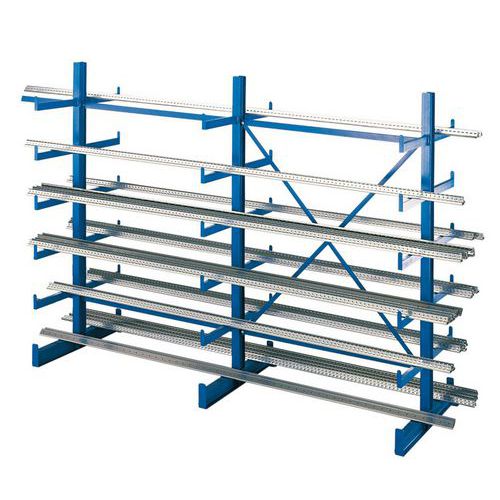Scaffalatura cantilever monofronte e bifronte per lo stoccaggio in orizzontale. Protezione anti-scorrimento per impedire la caduta dei materiali. Estensibile con l'aggiunta di 1 o più elementi successivi. Scaffalatura cantilever a montaggio rapido grazie ai bracci saldati. Montanti dotati di 5 o 10 bracci fissi con finecorsa. Passo tra 2 montanti: 1200 mm. Passo tra 2 braccia: 1225 mm.