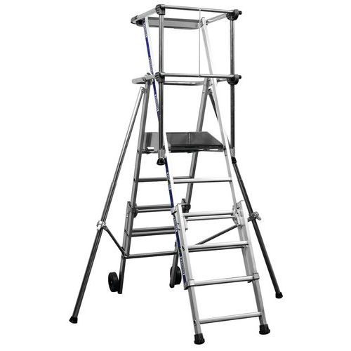 - Piattaforma singola mobile telescopica con finiture superiori, facile da spostare nei vostri cantieri. Apertura istantanea. Accesso con gradini antiscivolo. Installazione del parapetto con un solo gesto. Cancello a 2 battenti e chiusura di sicurezza automatica. Dotata di un ripiano superiore a elevata capacità dalla forma curva per consentire i lavori in prossimità di muri, 2 ganci porta-secchio e una maniglia di trasporto integrata.