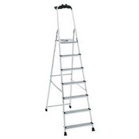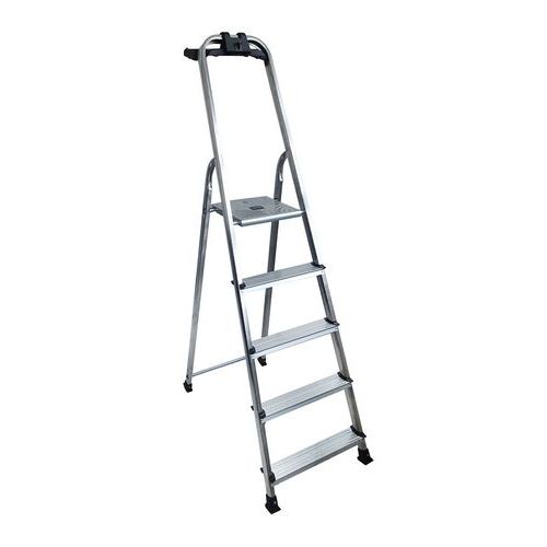 Scala in alluminio a elevata stabilità e sicurezza grazie ai parapetti. Sicurezza elevata grazie ai piedini antiscivolo, avvolgenti e antiallentamento. Resistente grazie al sistema di fissaggio dei gradini brevettato. Poggiapiedi in acciaio anticorrosione con sistema anti sollevamento. Pratico: portautensili multiuso con gancio portasecchio e alloggiamento per viti. Realizzato in Francia Carico max. (kg) : 150