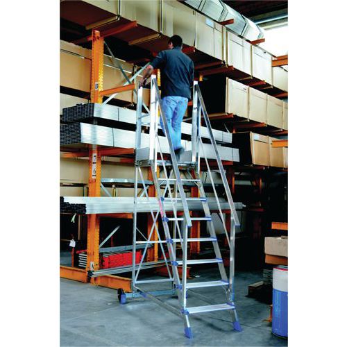 Scala inclinata a 60° per una comoda salita. Corrimano e parapetto da 1,10 m per la massima sicurezza. Il tronco di sostegno dritto a 90° permette di avvicinarsi all’area di lavoro. Il corrimano della scala e il parapetto della piattaforma sono alti 1,10 m per garantire la massima sicurezza. Dotata di 4 ruote girevoli con freno per un posizionamento più agevole. Piattaforma 800 x 600 mm.