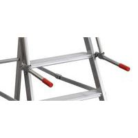 Scaletta professionale con 2 rampe di sicurezza. Impugnature pieghevoli per sollevare il pianetto. Cerniera a compasso in alluminio antichiusura e antidivaricamento. Rotelle ribaltabili, si attivano solo dopo il sollevamento del pianetto.