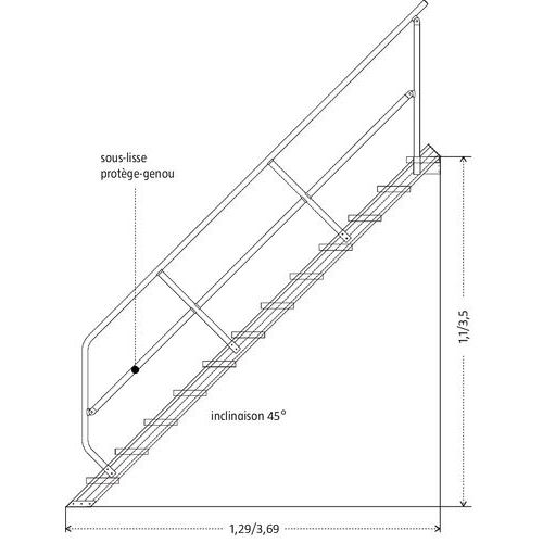 Scala preforata, pronta da fissare. Gradini molto resistenti alla torsione. Dotata di 1 corrimano da posizionare a sinistra o a destra, a scelta. Scala da fissare con cerniere in alto e staffe al suolo. Prodotto realizzato in Francia. Realizzato in Francia Carico max. (kg) : 150 Garanzia Cliente : 5 anni