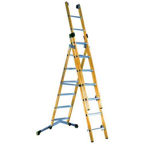Scala trasformabile a 3 rampe o a singola rampa d'appoggio. In poltruso di vetroresina stratificata. Ideata per svolgere lavori anche in situazioni sfavorevoli (come la presenza di dislivelli, gradini, pendenze o falsi piani).