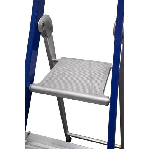Scala in alluminio laccato che non sporca e gradini fissi. Articolazioni ultrarigide rinforzate, sistema di protezione antischiacciamento dita integrato. Stabilità e massima durata del gruppo gradini/montanti. Ripiano rotante a doppia posizione per un ingombro ridotto. Ampi piedini a inserimento e gradini antiscivolo. Scala con ampia superficie d'appoggio a terra.
