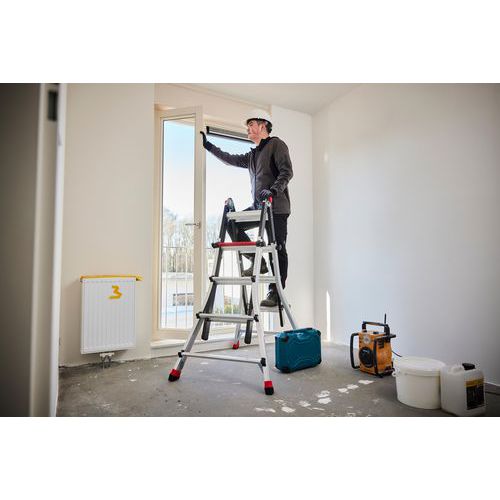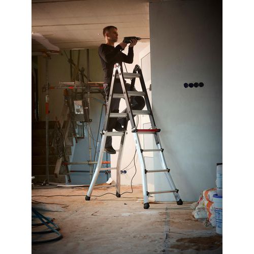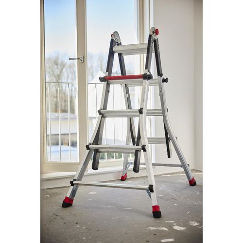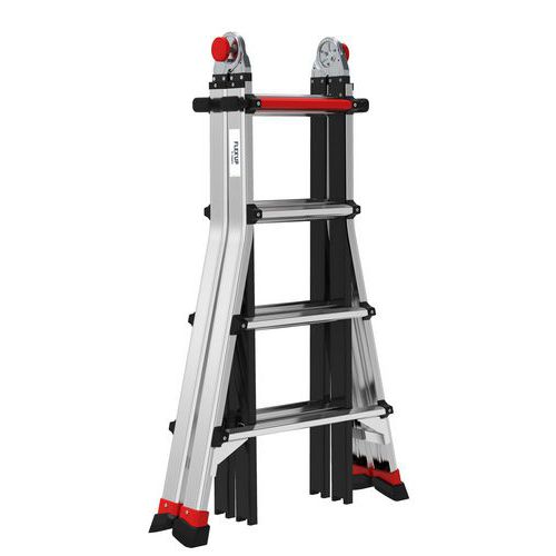 La scala FLEX'UP in alluminio Tubesca-Comabi consente un uso polivalente e facile in tutte le circostanze. Perfetta per spostarsi da un cantiere all'altro indipendentemente dalla configurazione. Sistema di accesso leggero, sicuro, compatto e comodo. Questa scala è conforme alla norma EN131-4. Scala multiuso. Facile da trasportare e da riporre. 2 posizioni: in posizione dritta chiusa o con doppia rampa di salita. Per un uso versatile e facile in tutte le circostanze. Piani telescopici scorrevoli. Articolazioni robuste a blocco automatico. Gradini obliqui per garantire un buon comfort di utilizzo. Basi svasate per una maggiore stabilità e un ingombro ridotto. Utilizzabile anche su dislivelli.