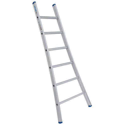 Scala singola in alluminio per uso professionale a base svasata. Comfort d'uso grazie alla semplice finitura in alluminio grezzo con profilo piatto. Scala dritta antiscivolo, posizione orizzontale al 100%. Per i professionisti che cercano una scala affidabile, sostenibile ed economica.