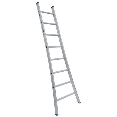 Scala singola in alluminio per uso professionale a base svasata. Comfort d'uso grazie alla semplice finitura in alluminio grezzo con profilo piatto. Scala dritta antiscivolo, posizione orizzontale al 100%. Per i professionisti che cercano una scala affidabile, sostenibile ed economica.