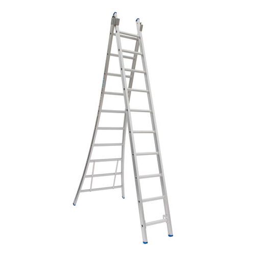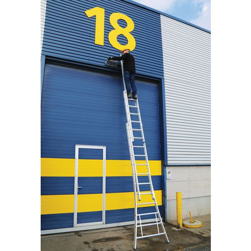 Scala scorrevole, separabile e trasformabile in scala doppia. Ganci sui gradini per il bloccaggio dei 2 elementi dopo l'estensione. Stabilità laterale ottimale garantita, con l’ampia base svasata. Scala a due rampe con rivestimento in poliestere. Non macchia le mani.