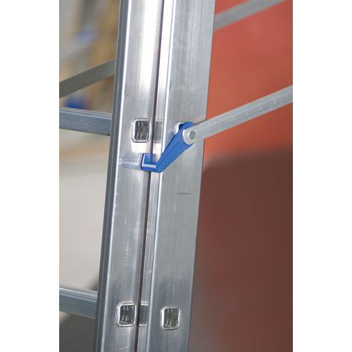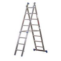 Scala resistente e leggera a due o tre rampe. Possibilità di usare la scala a cavalletto o allungata. Distanza tra i gradini: 280 mm Con cerniera antirottura in acciaio a posizionamento assistito. Gradino in alluminio 30 x 30 mm con angoli arrotondati. Aste antichiusura in alluminio. Con base stabilizzatrice dai tacchetti maggiorati. Dotata di cerniera antiribaltamento del 3° elemento. Con sistema di ribaditura automatica che fissa i gradini ai montanti evitando rotazioni o sfilamenti.