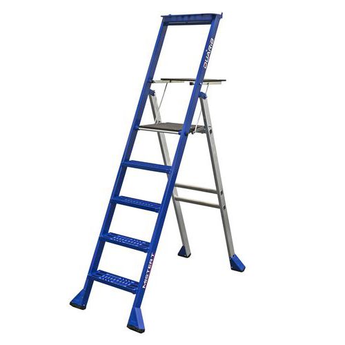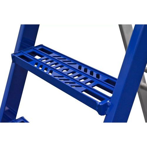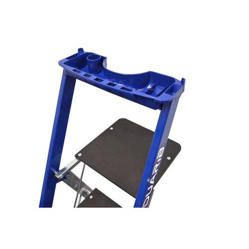Scaletta in alluminio laccato con ripiano per la vernice ribaltabile per fusto da 15 L (25 kg max). Ripiano per utensili molto capiente con due ganci integrati. Gradini fissati ai montanti mediante saldatura manuale per una tenuta superiore. Gradini a griglia antiscivolo di larghezza 100 mm, comodi e facili da pulire. Facile da usare, si ripone rapidamente.