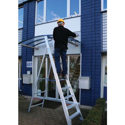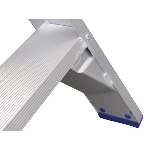 Scaletta per uso industriale pieghevole in alluminio con rivestimento in poliestere. Solida grazie al montante realizzato con profilo pesante a forma di «U». Struttura affidabile: gradini saldati al montante e rivettati. Piede a incastro nello zoccolo di sicurezza in gomma antiscivolo. Piattaforma a cerniere. Livello superiore con scomparto portautensili.