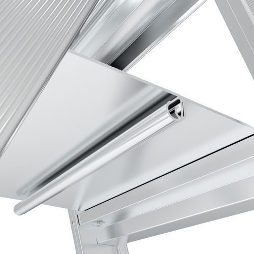 Scaletta a doppia rampa di salita in alluminio con sistema antidivaricamento che funge anche da poggiapiedi per il massimo comfort. I profili detti aperti conferiscono leggerezza e maneggevolezza alla struttura. Blocco di apertura nella parte alta per scavalcare gli ostacoli. Gradini profondi da 80 mm. Montanti robusti con profilo aperto facili da manipolare. Ripiegamento completo per un ingombro minimo. Anche disponibile con parapetto ribaltabile ultracompatto. Scaletta a doppio accesso, utilizzabile sui due lati.