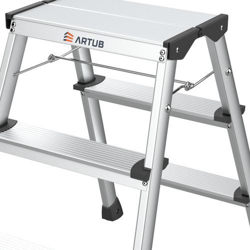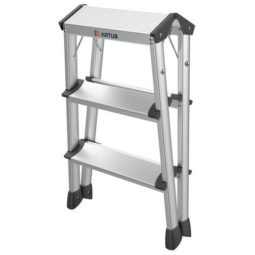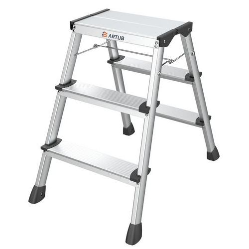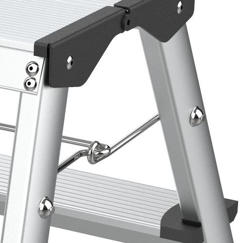 Scaletta di supporto per le operazioni quotidiane, con accesso da entrambi i lati per una maggiore praticità. Le aste rigide anti-apertura consentono il lavoro in altezza nella massima sicurezza. Piedini antiscivolo antiallentamento che garantiscono la massima stabilità. Il design in alluminio li rende estremamente leggeri. Molto comoda grazie al largo poggiapiedi (34,5 x 20 cm) e ai gradini con nervature antiscivolo.