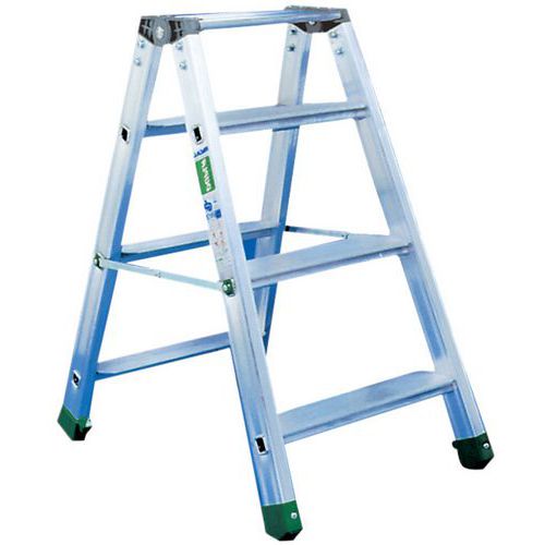 Scaletta in alluminio a doppia salita. Gradini da ambo i lati profondi 85 mm. Cerniere monoblocco in alluminio fuso. Compassi in acciaio antichiusura e antidivaricamento.