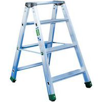 Scaletta in alluminio a doppia salita. Gradini da ambo i lati profondi 85 mm. Cerniere monoblocco in alluminio fuso. Compassi in acciaio antichiusura e antidivaricamento. Realizzato in Italia Carico max. (kg) : 150 kg