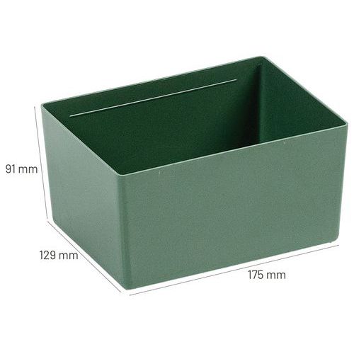 Scomparti rimovibili verdi di vari formati per modelli diversi di cassettiere. Per creare uno spazio interno in cui riporre in maniera ordinata materiali e componenti.