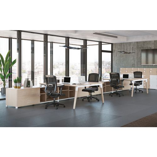 Scrivania bench per il vostro spazio di coworking. Base trapezoidale che combina il calore del legno massiccio alla solidità del metallo. Linea essenziale e naturale conforme alle tendenze attuali. Prodotto da completare con scrivania bench 2 posti elemento di partenza Dialogue. Realizzata per favorire l'ufficio flessibile e il coworking. Per lavorare in piena mobilità e scambiarsi facilmente con i colleghi.