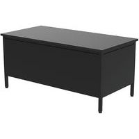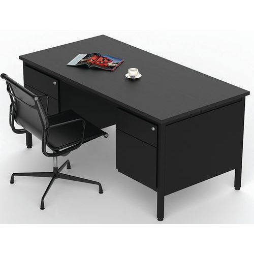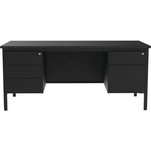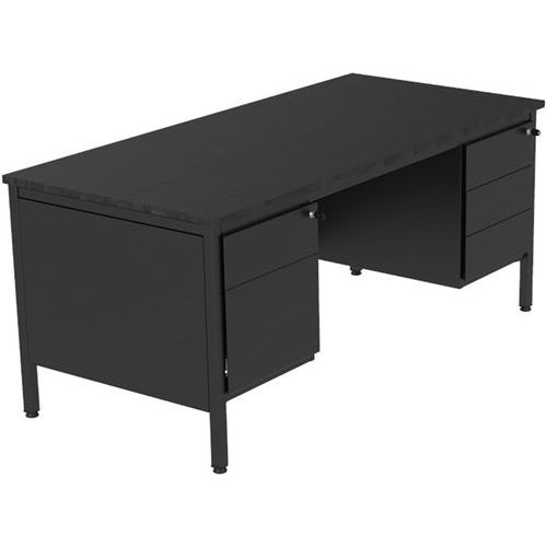 Scrivania direzionale Confort 2 con cassettiera. Gambe tubolari quadrate 35x35x2 mm con rinforzo angolare in metallo. Base su martinetti regolabili in materiale sintetico. Solida struttura metallica in lamiera da 1,5 mm. Le parti metalliche sono verniciate in polvere epossidica di poliestere. Altezza del tavolo fisso: standard a 75 cm (incl. top da 25 mm). Realizzato nell'UE