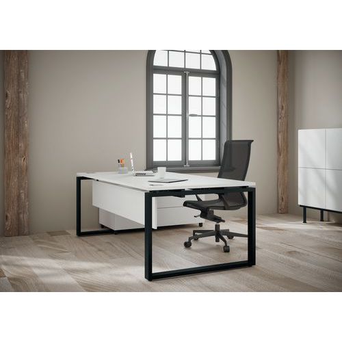 | Dati tecnici | Dimensioni: P160 x H73,5 x L240 cm - Mobile contenitore: P56,5 x H52,5 x L120 cm. Ripiano alveolare con spessore 38 mm, bordo in ABS 2 mm. Gamba ad arco in metallo a nastro. Mobile contenitore composto da 2 cassetti. Giuntura scrivania - Mobile composto da una gamba a nastro accorciata con H 15 cm. |