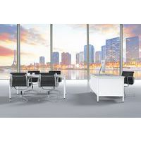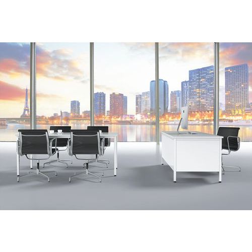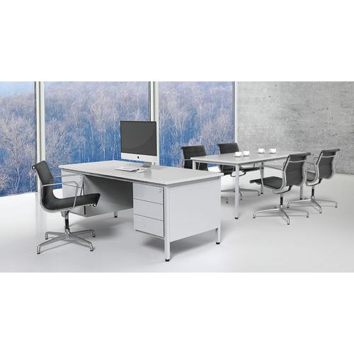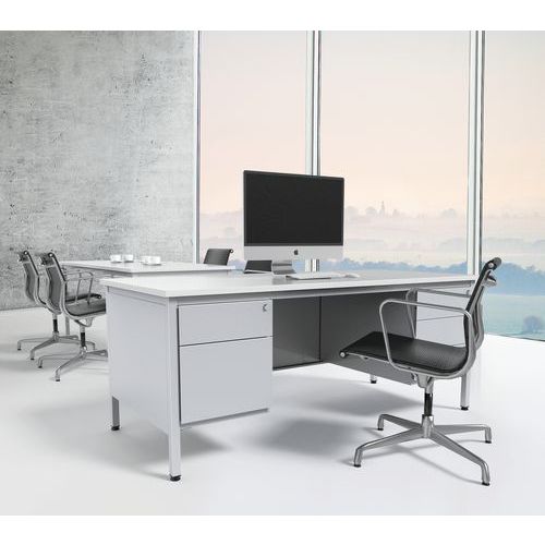Scrivania robusta e dal design classico. Ripiano antiriflesso ad alta resistenza (spessore: 25 mm). Cassettiera con chiusura centrale. La cassettiera può essere installata indifferentemente a destra o a sinistra. Piedi con martinetti di regolazione. Struttura autoportante e pannello di fondo in metallo.