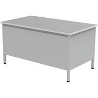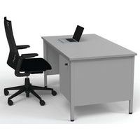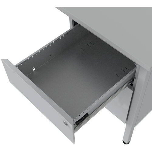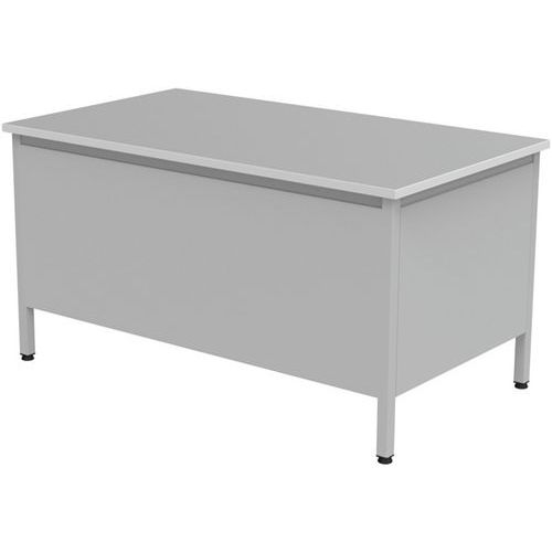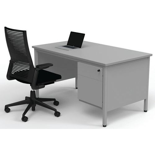 Scrivania robusta e dal design classico. Ripiano antiriflesso ad alta resistenza (spessore: 25 mm). Cassettiera con chiusura centrale. La cassettiera può essere installata indifferentemente a destra o a sinistra. Piedi con martinetti di regolazione. Struttura autoportante e pannello di fondo in metallo.