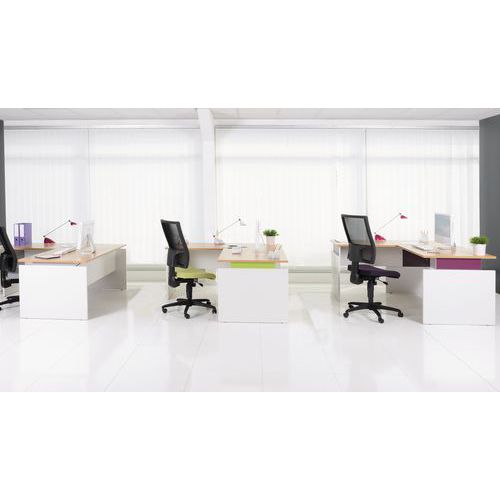 Piano molto resistente dotato di un otturatore. Bordi in PVC antiurto (sp. 3 mm). Pannello di fondo strutturale curvo. Regolabile in altezza: 3 posizioni (72 cm, 75,5 cm e 82 cm). La scelta migliore per scrivanie colorate