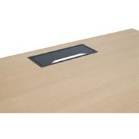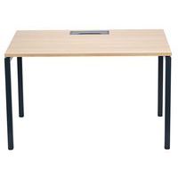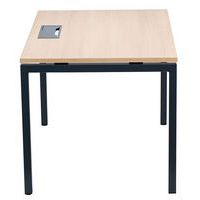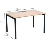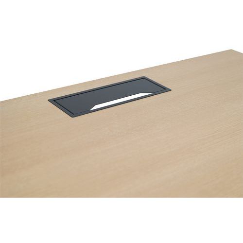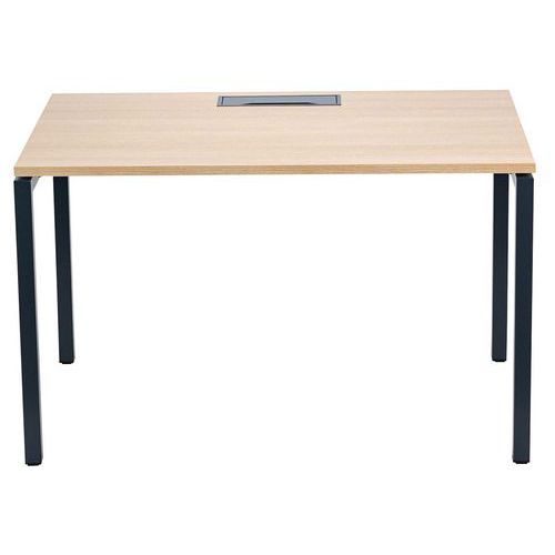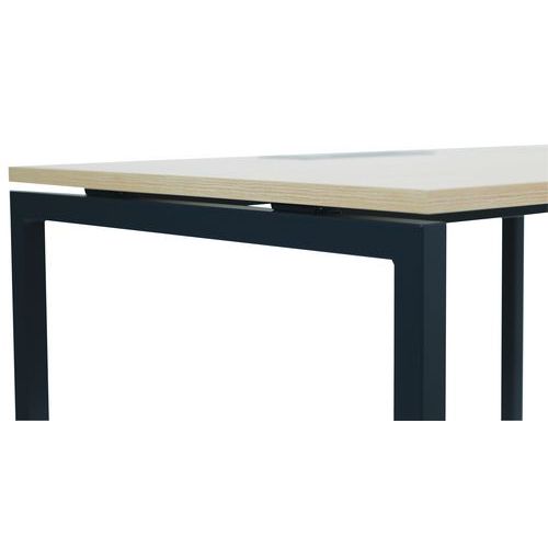 Scrivania dritta con piano in melaminico di 25 mm e profili in ABS di 2 mm. 2 travi di supporto in tubo metallico da 40x20 mm. Struttura dei piedi dritta in metallo 40x40 mm con piedi in plastica per il livellamento. Ripiano munito di apertura con tappo per il passaggio dei cavi.