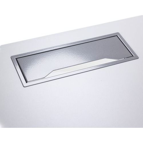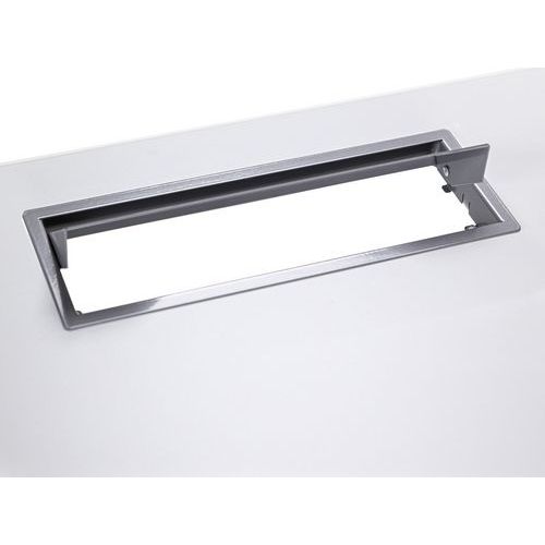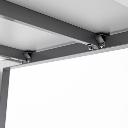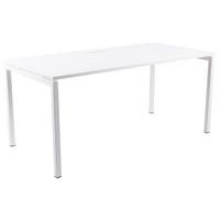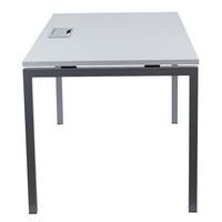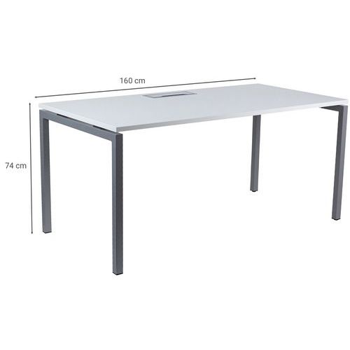 Scrivania dritta con piano in melaminico di 25 mm e profili in ABS di 2 mm. 2 travi di supporto in tubo metallico da 40x20 mm. Struttura dei piedi dritta in metallo 40x40 mm con piedi in plastica per il livellamento. Ripiano munito di apertura con tappo per il passaggio dei cavi.